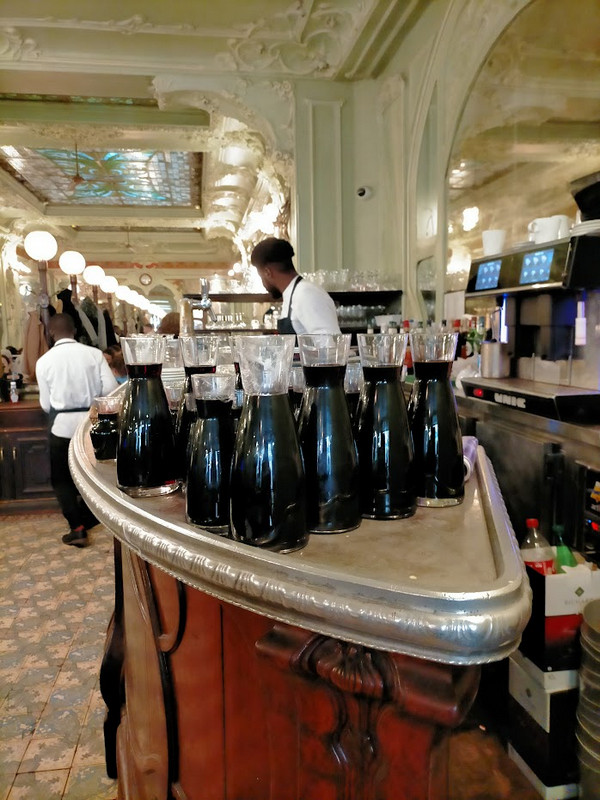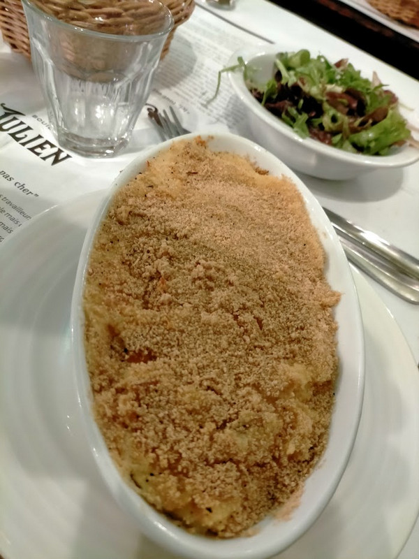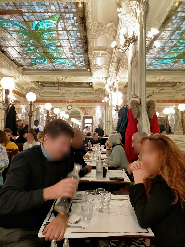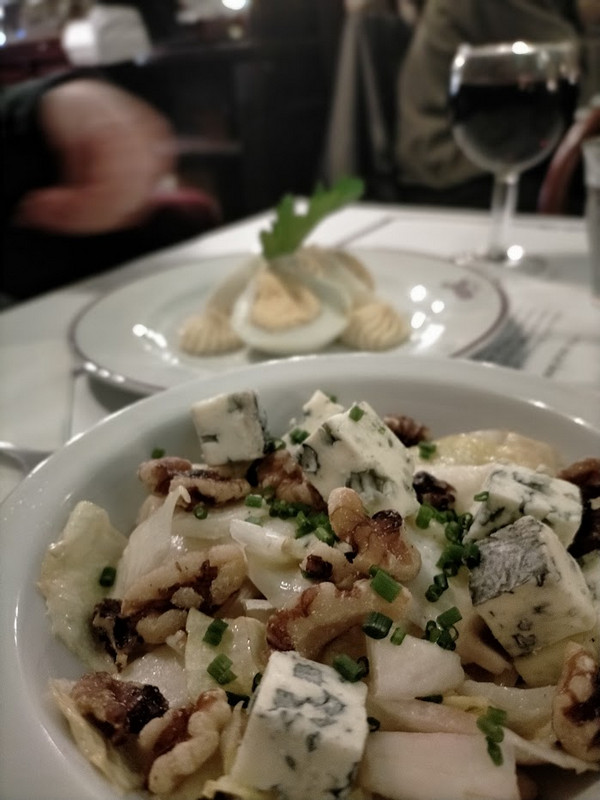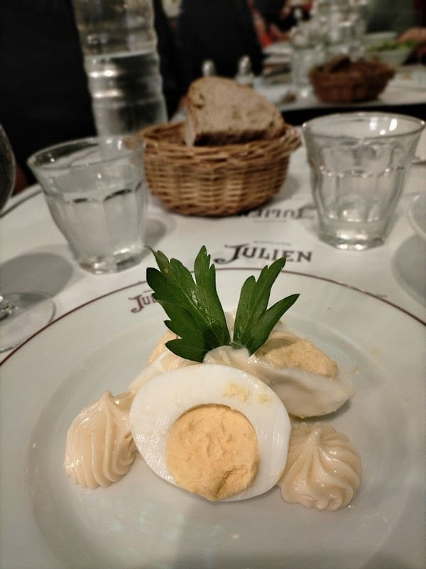 Dès qu'on franchit la porte du restaurant on remonte le temps. Pas de fausse note. Le service, la déco. On nous accompagne à un table. On pose nos affaires sur le porte-manteau, moi ma fourrure, lui son haut de forme. Il met son monocle et consulte la carte. Il choisit des œufs mayonnaises et le bouillon Julien, moi des endives aux noix et une brandade de morue ... pour quelques francs nous fûmes repus.
