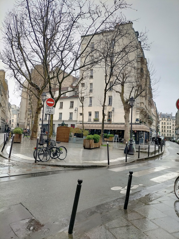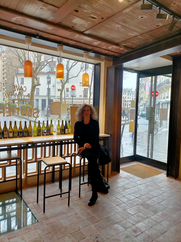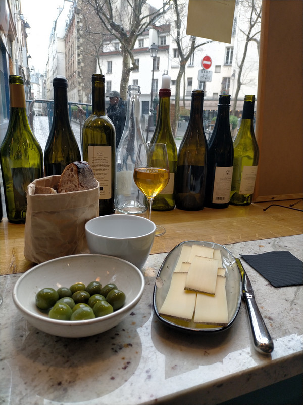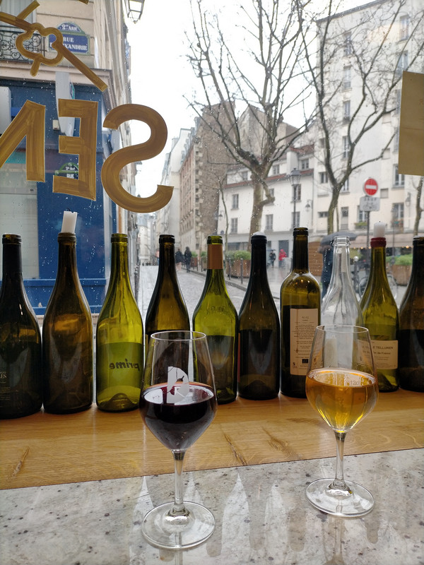 Il pleut. Il est midi. J'entre dans cette boutique de vin, qui sert du vin au verre et des assiettes à grignoter. Je m'attable devant la baie vitrée, je regarde la petite place et je profite.