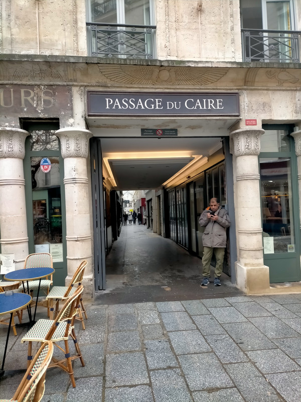 Je suis attirée par la statue bizarre, qui cache son visage, l'homme au bras levé. Je lève la tête, et je regarde la façade aux inspirations égyptiennes. J'entre dans le passage du Caire et je vais jusqu'au bout jusqu'à une autre petite place.